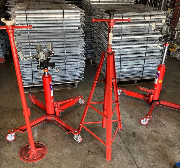 Telescoping Transmission Jack, Double Pump - Fast Jack; (2) Norco 3/4 Ton Capacity Under Hoist Stand w/ Pedal; (1) Norco 1-1/2 Ton Capacity Tri-Pod Under Hoist Stand.